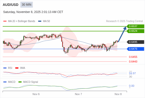 技术点评: RSI技术指标大于中性区域50。 MACD技术指标处在其信号线之上看多。 配置为正。 此外,价位高于其20天及50天移动平均线 ( 分别位于0.6486 和0.6482 )。