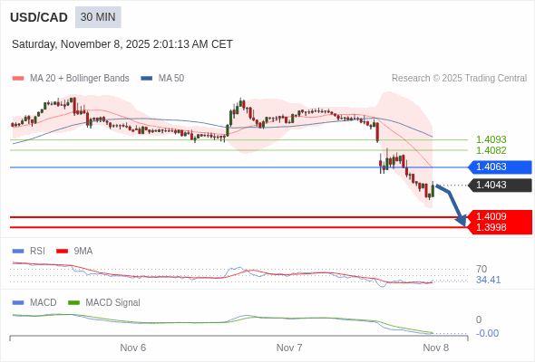 技术点评: RSI技术指标小于中性区域50。 MACD技术指标处在其信号线之下看空。 配置为负。 此外,价位低于其20天及50天移动平均线 ( 分别位于1.4063 和1.4097 )。